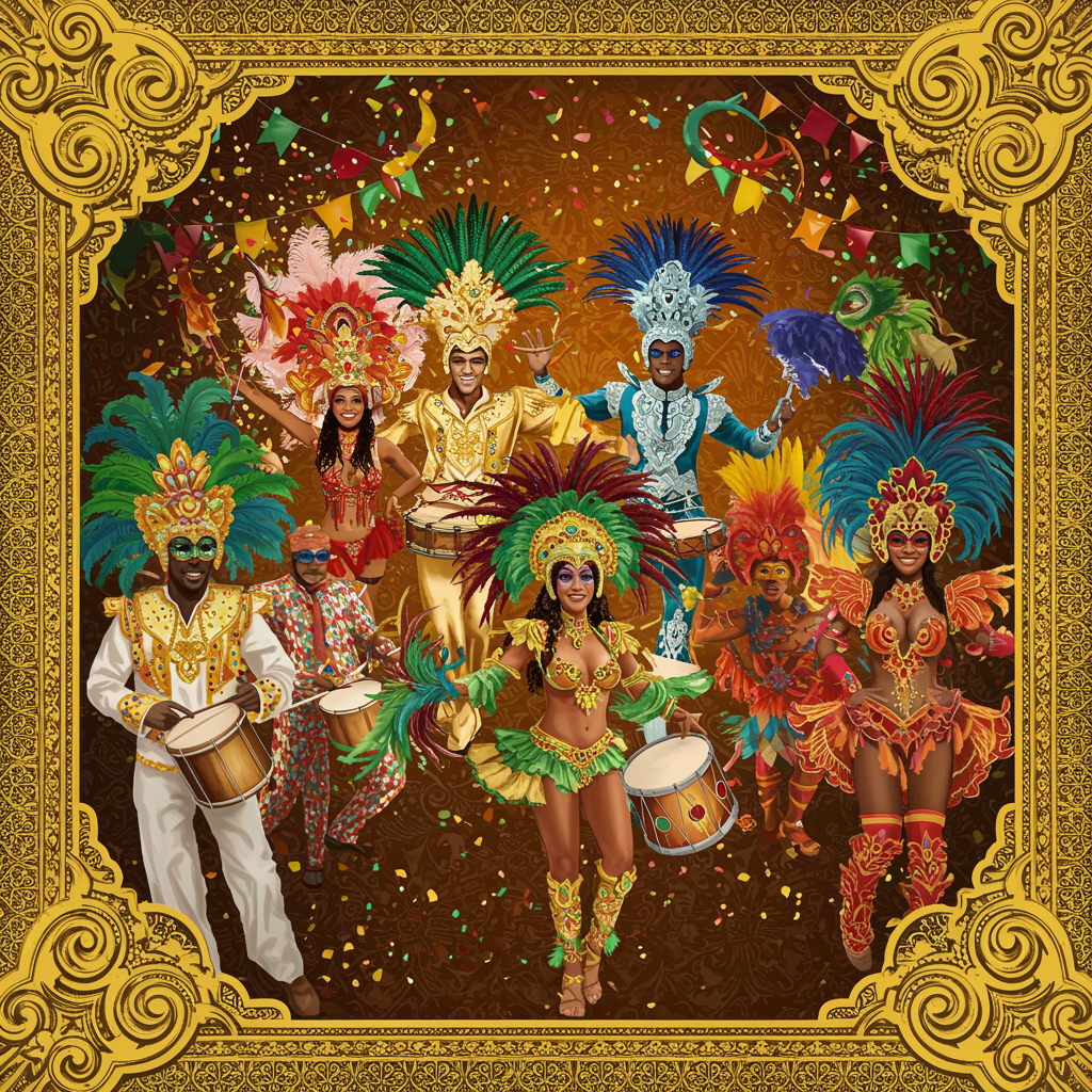 A vibrant and colorful Brazilian carnival celebration set against an ornate, decorative background, surrounded by intricate, gold-accented borders. The scene bursts with lively dancers in elaborate costumes, feathered headpieces, and glittering masks, all moving energetically to the rhythm of samba. Confetti fills the air, mingling with the vivid hues of the performers' outfits, creating a dynamic and festive atmosphere. The background showcases elegant patterns reminiscent of traditional Brazilian art, enhancing the sense of joyous celebration.