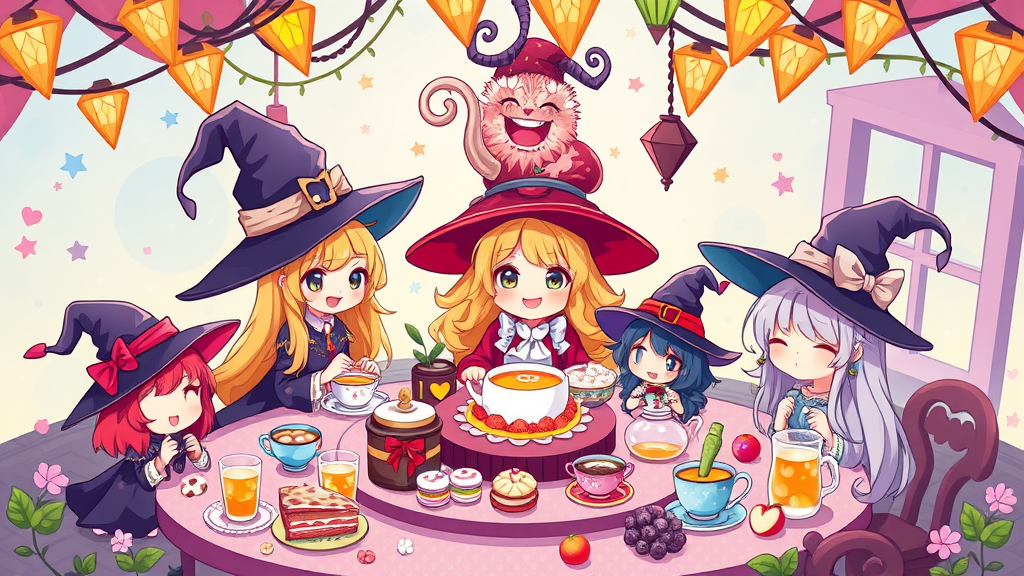 A vibrant and colorful chibi scene of a joyful witch tea party, capturing a whimsical masterpiece filled with cute, happy characters gathered around a delightful assortment of magical teas and treats, with an enchanting atmosphere that radiates warmth and cheer.