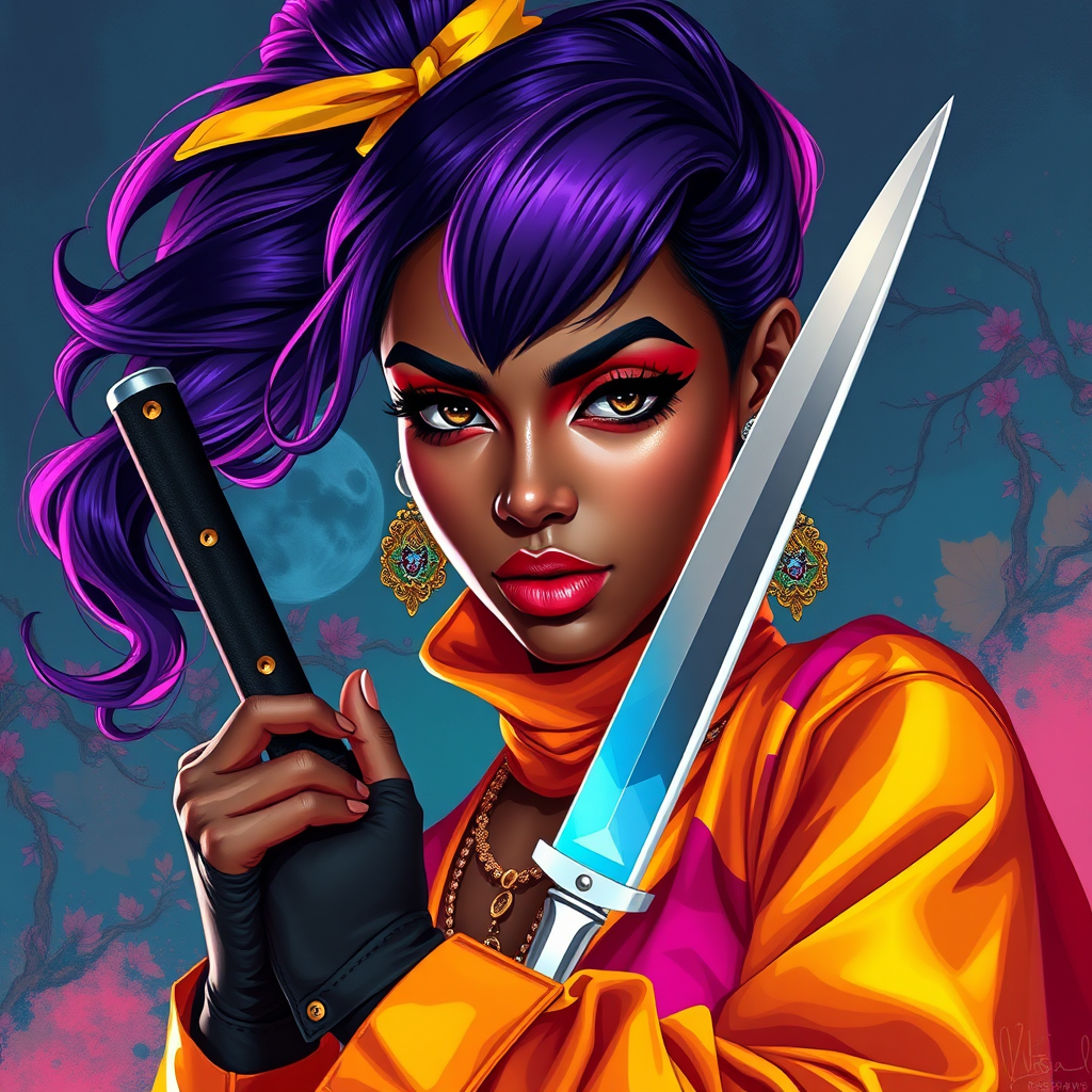 A vibrant and colorful digital painting of an Arab woman with striking purple hair, dressed in a vividly colorful outfit, confidently holding a knife. The art style is inspired by Rossdraws, featuring a fusion of Afrofuturism elements and cartoon aesthetics with a touch of realism. The scene is brought to life with hyper-realistic vibrant colors and dark, rich tones, capturing the energy and dynamism of the character. The composition blends the creative flair of concept art with pastel and bold hues, creating a stunning, gorgeous piece that feels both fantastical and grounded in contemporary digital art trends.