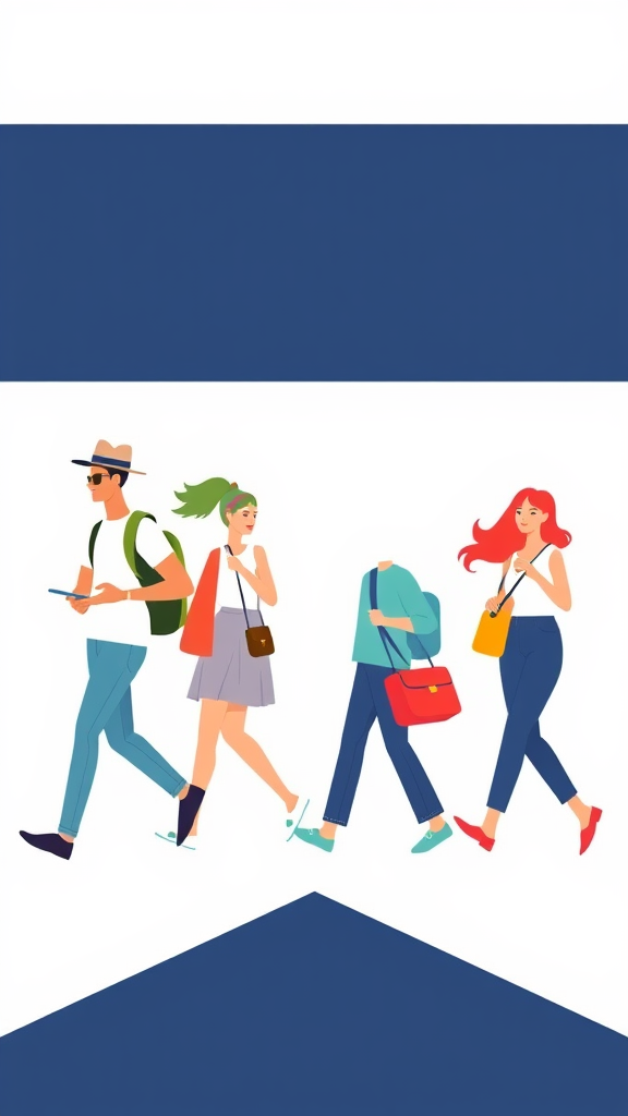A vibrant and colorful illustration showcasing tourists in motion, featuring simplistic and clean shapes against a minimalistic white backdrop, employing a fresh and energetic flat design with a harmonious blend of hues.