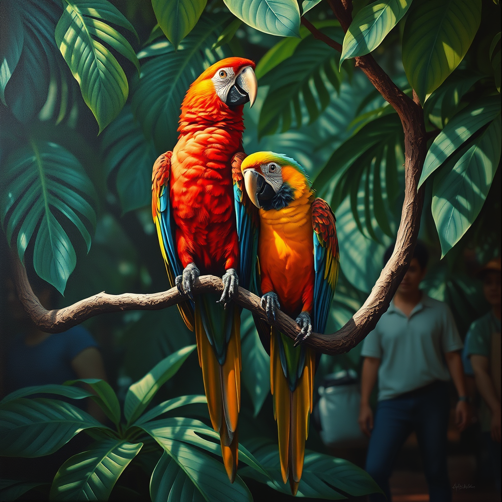 A vibrant and colorful painting showcases two parrots perched on a twisting branch, capturing the essence of an exotic jungle setting. The scene is rendered in a style reminiscent of Marcin Sobas, with meticulous attention to detail that brings the birds' vivid plumage to life. Intense contrasts of light and shadow create a dynamic interplay across the scene, casting dramatic patterns on the leaves surrounding the parrots. The composition includes subtle elements of people in the background, their figures softly blurred, blending harmoniously with the natural setting. The use of oil paints brings depth and texture, with the effect of a Ferrania P30 film, enhancing the vibrant colors and moody atmosphere. The unusual aspect ratio draws the viewer's eye through the composition, emphasizing the grace and beauty of the birds within their lush habitat.