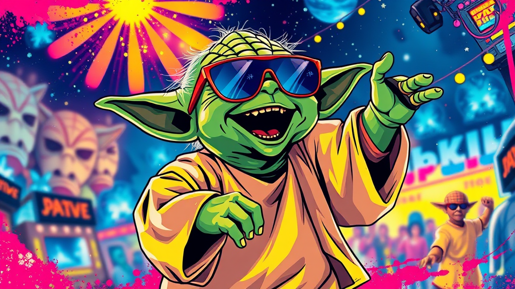 A vibrant and colorful t-shirt design featuring Yoda wearing cool sunglasses, joyfully dancing at a lively festival. The illustration incorporates dynamic ink splash effects for added flair, rendered in ultra-high clarity 8k resolution, capturing an energetic and festive atmosphere with creative touches.