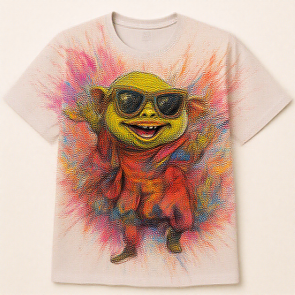 A vibrant and colorful t-shirt design featuring Yoda wearing stylish sunglasses, dancing energetically at a lively festival with an ink splash effect, rendered in stunning 8k detail, capturing the joyous festival atmosphere.
