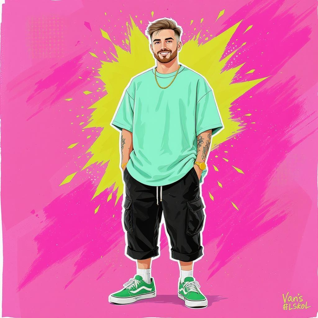 A vibrant and creative illustration of a full-body man wearing a mint green, oversized T-shirt and black capri cargo pants paired with green Vans Old Skool sneakers. The man is artistically integrated into a vividly colored digital artwork featuring bold outlines with captivating bright pink, neon green, and magenta tones. The artwork adopts a playful and cute cartoonish style, with the man standing against a dynamic and colorful background wall, filled with energy and vibrancy.