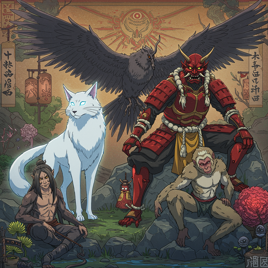 A vibrant and detailed anime style illustration showcasing a kitsuné with glowing eyes and ethereal fur, standing gracefully beside a menacing Oni with intricate red and black armor. Nearby, a Nué featuring a unique blend of tiger, monkey, and snake elements lounges on a rock. Above them, a majestic Tengu with expansive, feathered wings watches over the scene. The environment is adorned with funji decor, adding a mystical and otherworldly atmosphere, all rendered in HD 2K resolution with meticulous attention to detail and vibrant colors.