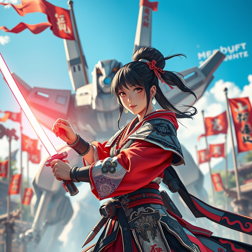 A vibrant and detailed cinematic movie poster featuring a young woman in futuristic, intricate samurai attire, wielding a glowing saber. Behind her, traditional bows and flags wave in the breeze, set against the backdrop of an ancient, towering Mech. The scene is bathed in bright, sunny weather, capturing anime and manga-inspired graphics with high detail and vivid colors. The poster conveys a sense of happiness and adventure, utilizing natural lighting to enhance the scene's rich CMYK palette, rendered in stunning 8K HD resolution.