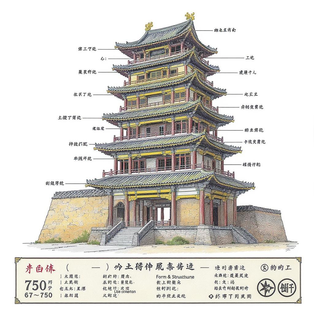 A vibrant and detailed cross-section of an ancient Chinese tower rendered in colored pencil style, featuring realistic shadows to enhance depth. Each level of the tower is labeled to emphasize key features such as rooms, connecting bridges, and architectural details. At the bottom, a text panel provides information about its historical significance, including frame size, dimensions, height, weight, and materials used. Insights into the form and structure type, construction technology, user requirements, and related drip icons are also included. The illustration is set against a pristine white background, maintaining an aspect ratio of 67:128 with a stylized finish of 750. Small creative enhancements give a fresh perspective while preserving the essence of the original theme.