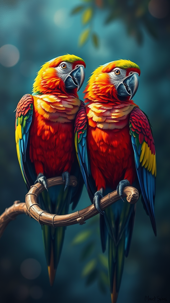 A vibrant and detailed painting of two parrots perched on a twisting branch, capturing the essence of Marcin Sobas' style, rendered in an intricate 32k UHD quality. The scene blends animals and people through a subtle, abstract reflection of human emotion in the parrots' expressions. The artwork is crafted with oil painting techniques, showcasing the drama of intense light cascading over the feathers, creating deep shadows and luminescent highlights. The color palette is rich and dynamic, echoing the vivid tones of a Ferrania P30 film, set against a blurred, impressionistic background to emphasize the birds. The aspect ratio is an unconventional 36:55, giving it a unique vertical orientation, and the composition includes elements of stylization at a moderate level of 750, ensuring a dreamlike yet vividly realistic portrayal, a true version 6 masterpiece.