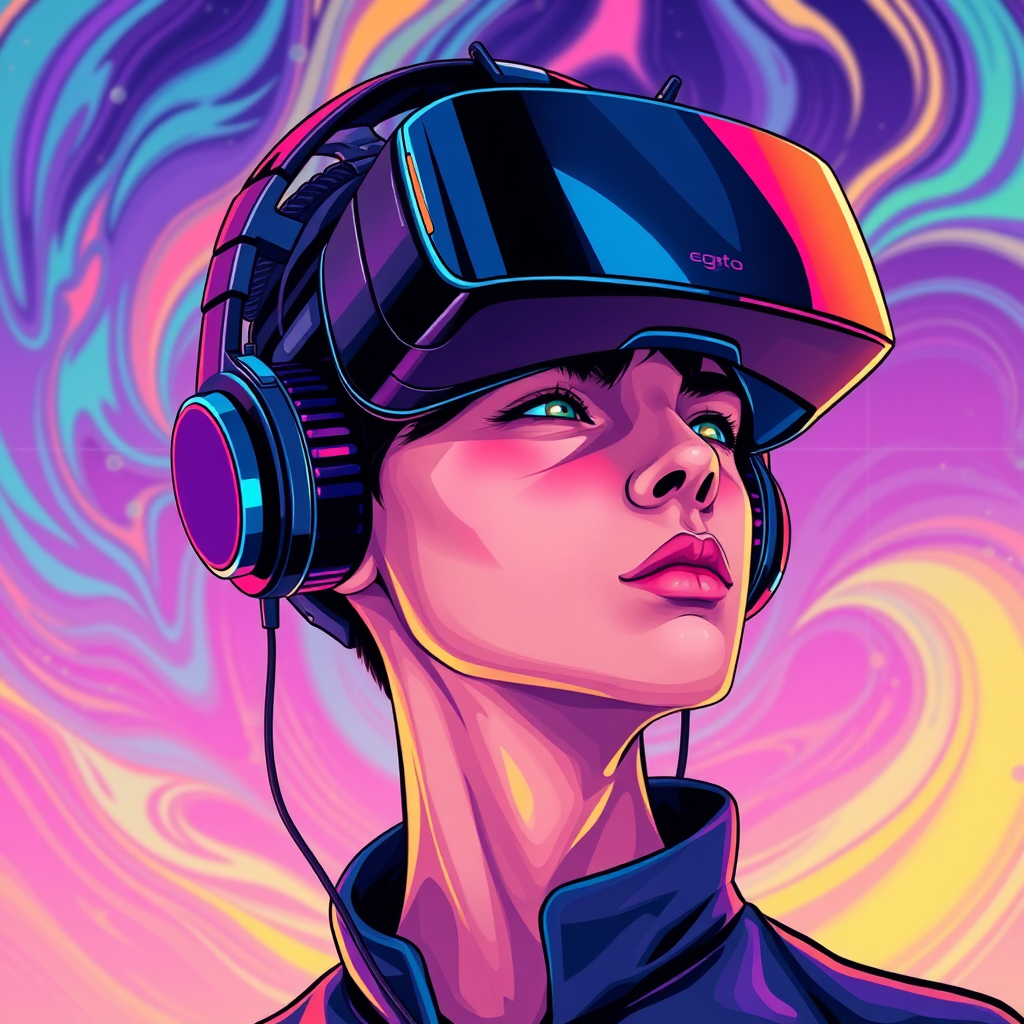 A vibrant and detailed vector art image of a person wearing a futuristic virtual reality headset and sleek headphones, inspired by Victor Mosquera's neo-dada style. The artwork captures a vaporwave aesthetic with a blend of cartoonish elements and hyperrealism. The person's face is illuminated by neon colors, reflecting the digital world within the VR set. The background features abstract, swirling patterns reminiscent of a digital landscape, creating an immersive and surreal atmosphere.