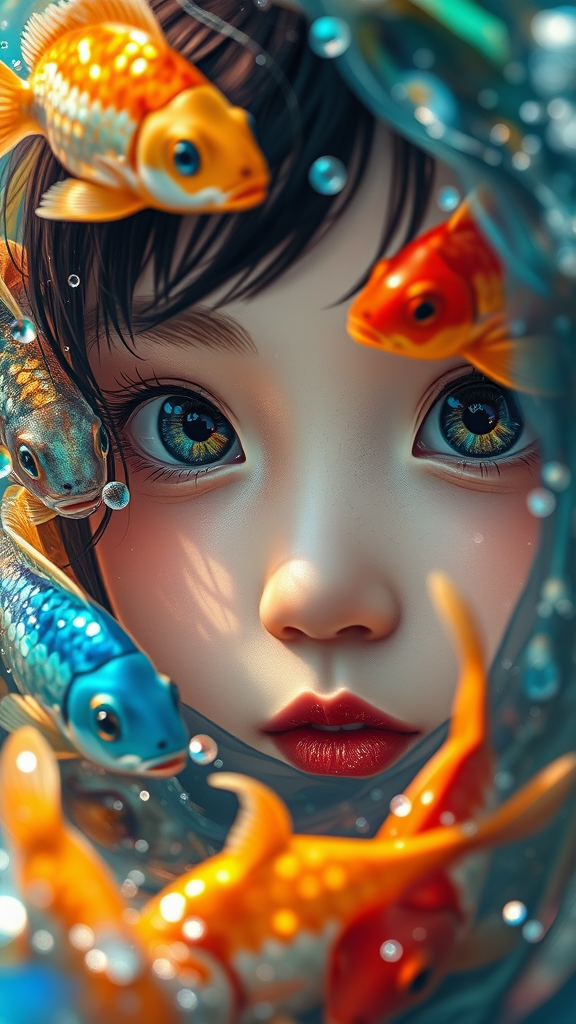 A vibrant and dreamy scene featuring a close-up of a cute girl's face intertwined with brightly colored fish, inspired by the styles of Makoto Shinkai and Otomo Katsuhiro. Her captivating eyes are framed by a hyper-detailed, oil-brush texture. Half of her face emerges from shimmering water, displaying an exaggerated perspective that highlights the intricate details. A mystical glow casts yellow and blue hues, with the Tyndall effect enhancing the ethereal atmosphere. Water droplets add a mother-of-pearl iridescence, while hints of holographic white and subtle green elements form a lush backdrop, enveloping the composition in a serene and enchanting ambiance.