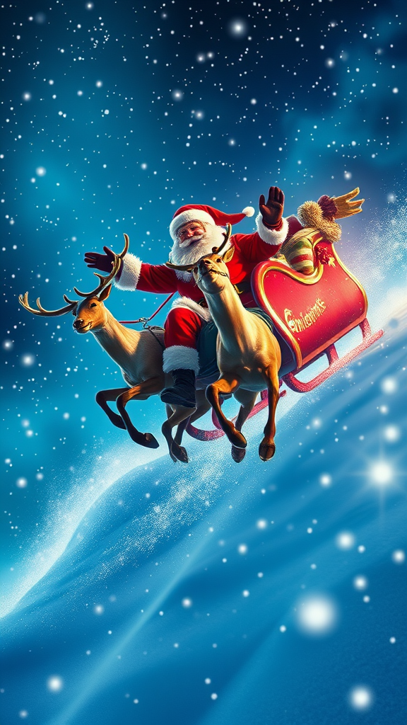 A vibrant and dynamic Christmas card scene featuring Santa Claus joyfully guiding his sled through the snowy night sky, capturing the essence of a 32k uhd experience. The artwork is inspired by the quadratura style, bringing a sense of grandeur and dimension. The atmosphere buzzes with energy, as the reindeer leap forward with enthusiasm against the mesmerizing backdrop of twinkling stars. The image radiates festive cheer and adventure, expressed with a touch of lively chaos. The composition is tailored to a 9:16 aspect ratio, emphasizing the vertical journey of Santa's sleigh across the vast night above, with a stylized flair that brings warmth and character to the scene.