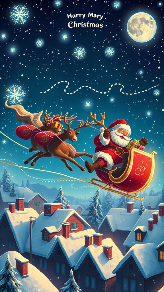 A vibrant and dynamic Christmas card scene featuring Santa Claus in his sleigh, depicted in ultra-high definition style with intricate quadratura details. The image bursts with lively energy, showcasing Santa in a joyful flight across a starry night sky, his sleigh laden with gifts. The elongated 9:16 aspect ratio enhances the sweeping motion of reindeer pulling the sleigh through a panorama of twinkling stars and snow-capped rooftops. The scene is infused with a touch of creative chaos, adding a whimsical flair to the traditional imagery. The overall stylization is richly detailed, bringing warmth and festive cheer to this timeless holiday depiction.