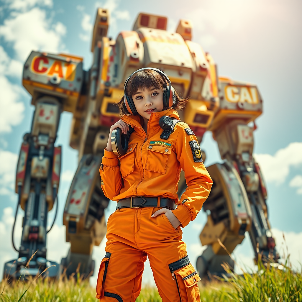 A vibrant and dynamic movie poster features a young female DJ wearing a futuristic, intricately designed orange jumpsuit, clutching a pair of sleek headphones. She stands confidently in front of an imposing, weathered mech that towers in the sunny landscape. The scene is bathed in bright, happy colors, reminiscent of anime and manga graphics, capturing high detail in an offset printing style. Music and sound waves seem to pulsate around her, adding energy to the composition. The poster is in 8K HD and CMYK, with natural lighting highlighting the DJ's spirited expression, evoking a sense of joy and excitement.