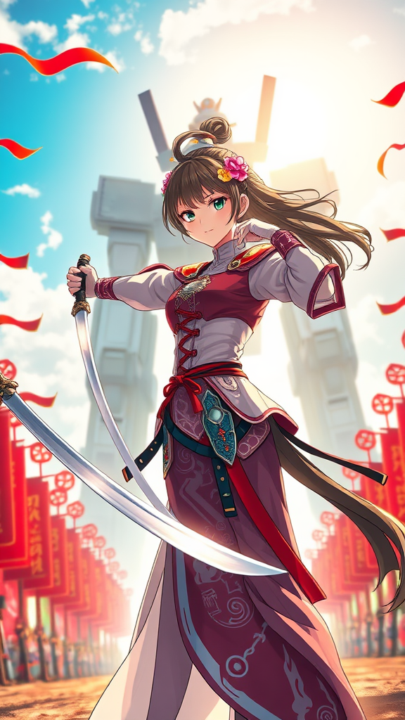 A vibrant and dynamic movie poster showcasing a young woman in elaborate, futuristic samurai attire, brandishing a gleaming saber. Her stance is poised and powerful, set against a dramatic backdrop of fluttering banners and grand ceremonial bows. In the distance, the silhouette of a majestic, ancient Mech looms under a bright, sunny sky, casting a nostalgic yet awe-inspiring presence. Rendered in bold anime and manga-inspired visuals, the scene bursts with vivid colors and intricate details, emphasizing high-definition quality reminiscent of offset printing. The poster exudes a sense of joyful determination in natural lighting, capturing the essence of a richly animated world in 8K resolution, designed to captivate with its cinematic flair.