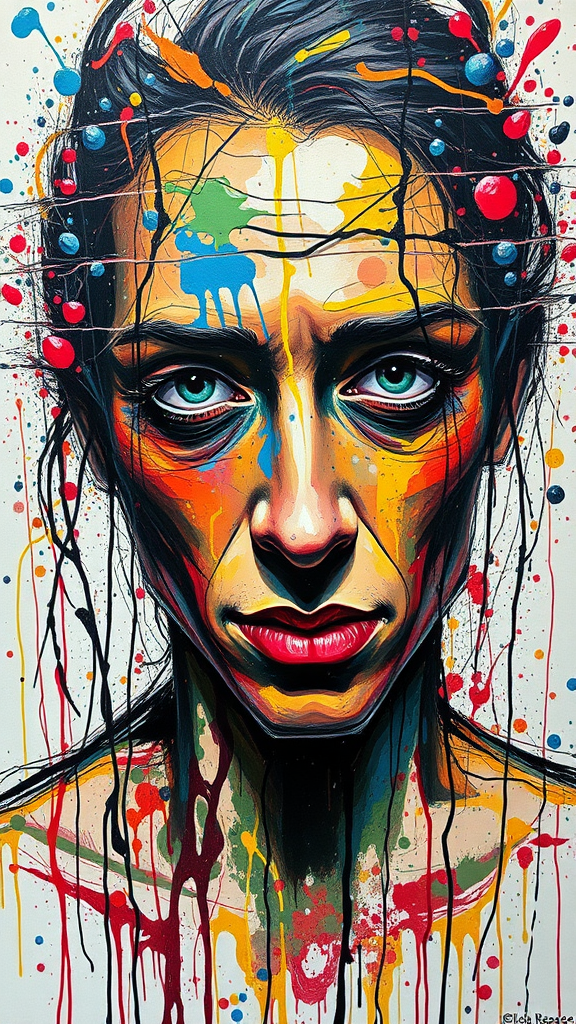 A vibrant and dynamic self-portrait of an abstract expressionist painter, layers of paint energetically splattered and dripped across the canvas, capturing the tumultuous inner world and raw emotion, chaotic lines and splashes intertwining to form a distorted, yet compelling representation of the artist's essence and energy.