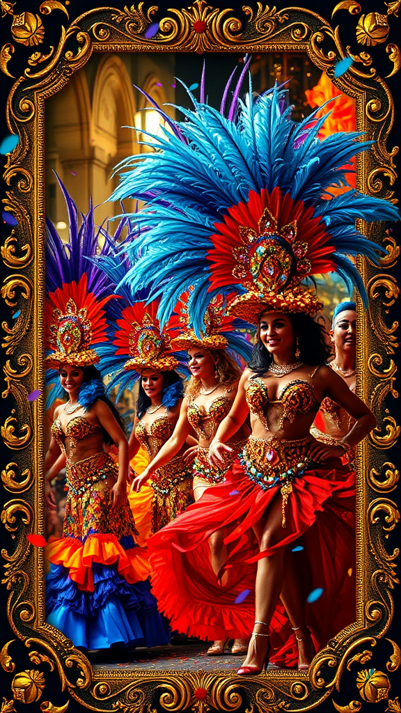 A vibrant and elaborate Brazilian carnival celebration featuring dancers in extravagant costumes, set against a lavish background adorned with intricate, ornate borders. The scene is alive with a riot of colors: brilliant blues, fiery reds, and glittering golds that dance under the glowing lights, capturing the essence of the pulsating samba rhythms. Towering feathered headdresses and intricate beadwork highlight the dancers’ energetic movements, while a kaleidoscope of confetti flutters through the warm evening air. The tall, narrow scene is framed by gilded patterns reminiscent of Baroque architecture, adding a touch of elegance to the festive atmosphere.