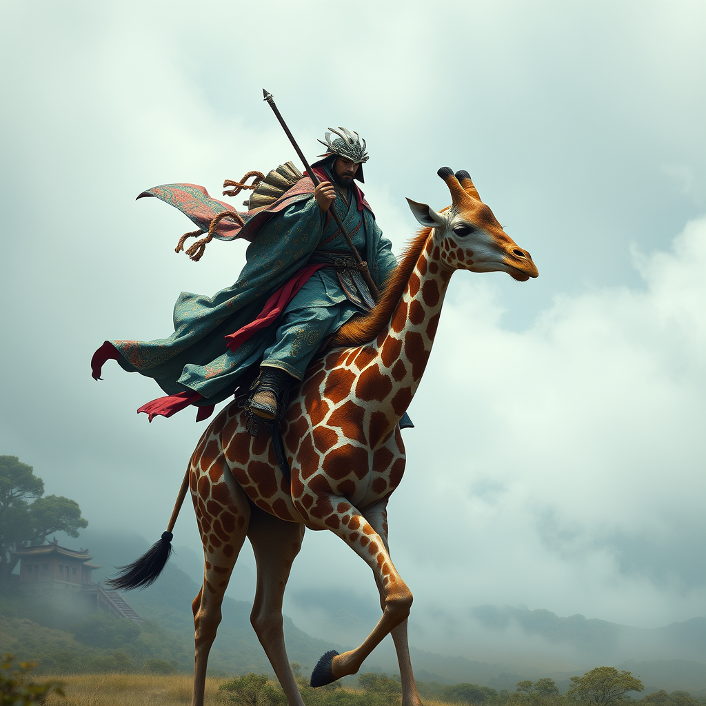 A vibrant and emotive artwork depicting a samurai with flowing robes, intricately designed in DNA-inspired motifs, perched atop a majestic giraffe with an elongated neck. The scene is infused with a photorealistic attention to detail, capturing the essence of movement and emotion. The giraffe strides gracefully through a misty landscape, with expressions of resolve and harmony on the samurai's face. The atmosphere channels the emotive storytelling style of Dmitri Danish and Marcin Sobas, where emotion is delicately woven into the visual narrative, set against a 3:4 aspect ratio.