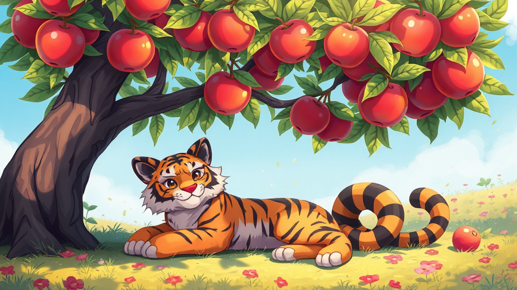 A vibrant and enchanting digital illustration of a magnificent tiger-like Pokémon lounging gracefully beneath a flourishing apple tree, depicted in a whimsical cartoon style with elements of Matte Painting and Magic Realism. The scene bursts with bright and lively colors, showcasing an exquisitely detailed and high-resolution artwork. The playful creature's fur glistens with subtle magical sparkles, blending harmoniously with the lush, oversized apples hanging from the tree's branches. A gentle breeze rustles the leaves, adding a dynamic sense of movement to this serene and captivating environment.