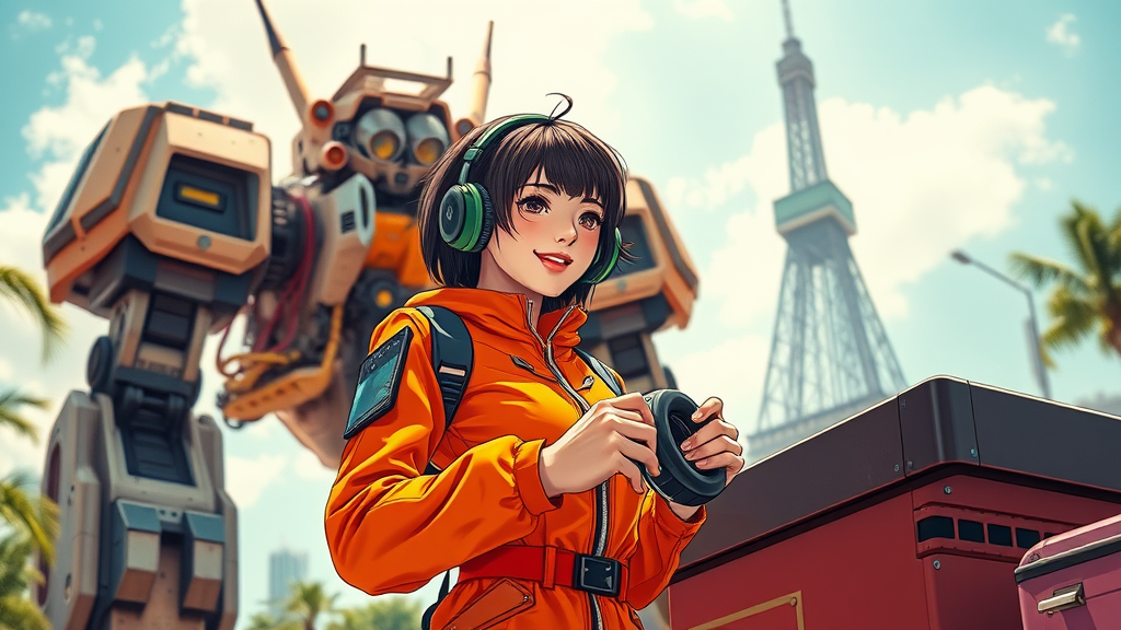 A vibrant and energetic scene featuring a young female DJ in a futuristic, intricately designed orange jumpsuit, exuding confidence as she holds a sleek pair of headphones. The setting is reminiscent of a dynamic movie poster, with cinematic flair and an engaging ambiance where music and sound swirl in harmony. In the background, a majestic, vintage Mech towers, its presence adding a sense of timelessness and intrigue. The day is bright and sunny, casting natural light that enhances the colorful, anime-inspired illustration. The graphic style, influenced by manga, boasts bright, vivid colors, reminiscent of offset printing techniques. The composition is rendered in high detail, aiming for 8K resolution in HD quality, with a CMYK color scheme that brings the scene to life. The overall atmosphere is one of happiness and excitement, capturing a moment where technology, art, and music converge in a futuristic landscape.