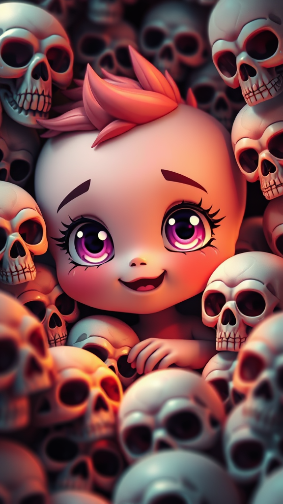A vibrant and engaging close-up of an adorable cartoon character surrounded by an array of stylized skulls, blending influences from artists like Lois van Baarle, Ross Tran, and Beeple. The character features bright, expressive eyes and a playful expression, set in a detailed scene illuminated with soft global lighting. The art infuses a cute, fantasy-like quality with rich, intricate textures and colors, akin to Jeremiah Ketner’s whimsical style. The composition integrates Artgerm’s sleek realism and Ross Tran’s dynamic energy, creating a delightful and captivating digital painting that merges the charm of 3D character art with enchanting detail and depth.