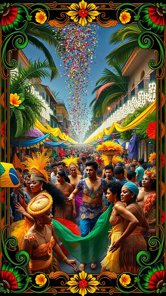A vibrant and extravagant scene depicting the lively essence of a Brazilian carnival celebration, filled with a riot of colors and dazzling costumes. The background is adorned with intricate borders featuring swirling patterns of tropical flowers and feathers. The atmosphere is electric with jubilant crowds, samba dancers in ornate headpieces, and traditional musicians playing energetic rhythms. Amidst the festivities, glitter confetti sparkles in the air against a backdrop of festively illuminated streets. The scene captures the essence of cultural exuberance and joy, embracing the spirit of unity and festivity.