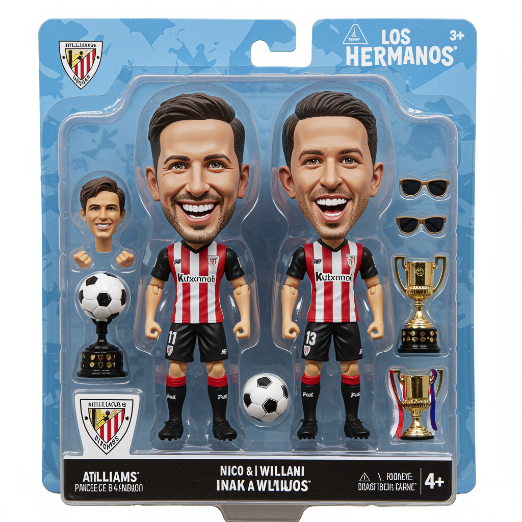 A vibrant and eye-catching collectible action figure set in a toy package labeled "Williams Bros" for ages 4+, showcasing the dynamic duo, Nico and Inaki Williams. They are sporting their signature Athletic de Bilbao jerseys paired with sleek black soccer boots. The package features a fun array of interchangeable accessories, including a La Liga ball, a gleaming Copa del Rey trophy, and a pair of stylish sunglasses. The background of the packaging bursts with energy in bright sky blue, adorned with white bold text proclaiming "LOS HERMANOS". The figures are designed with humorously exaggerated, caricatured heads, capturing their spirited personalities in a playful, satirical style, making it a must-have for fans and collectors alike.