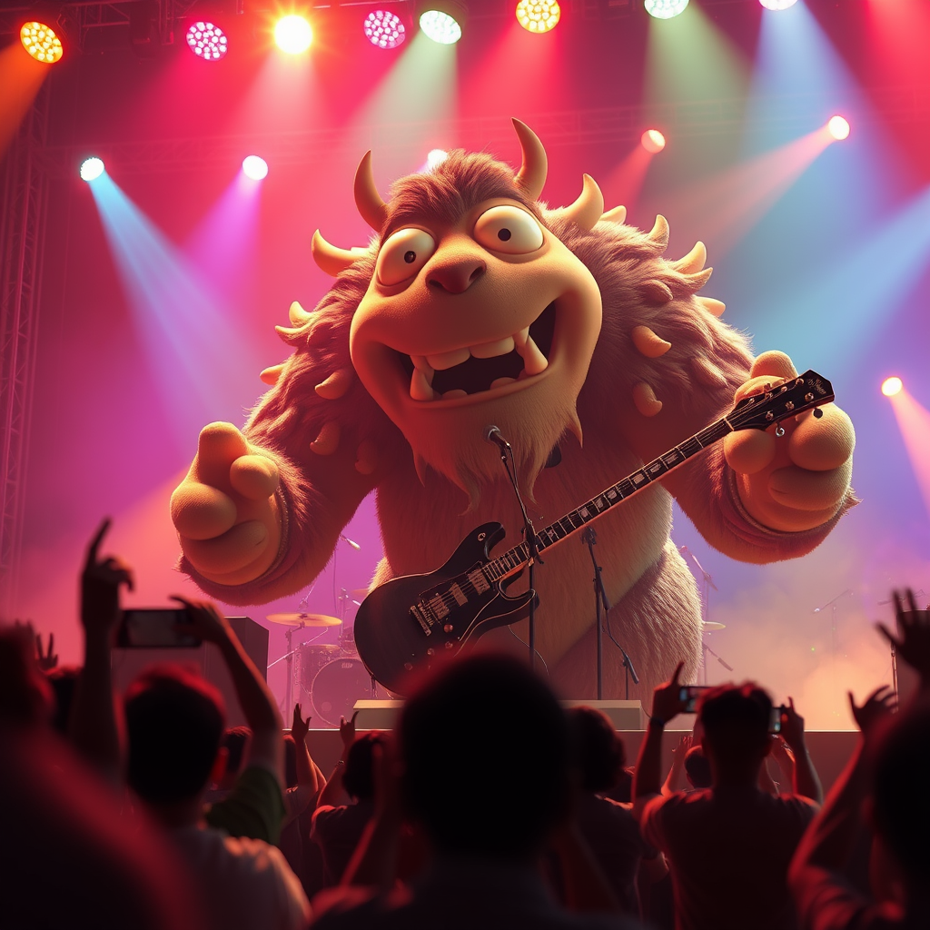 A vibrant and heartwarming animation key shot captures a colossal band behemoth energetically performing on stage, with a medium shot emphasizing its dynamic presence. Inspired by the creative essence of Studio Ghibli, Pixar, and Disney animation, the scene is intricately depicted in 3D, with sharp details and stunning realism rendered in Unreal Engine 5. The atmosphere is akin to anime key art by Greg Rutkowski, featuring a magical bloom effect and dramatic lighting that bathes the scene in a warm, ethereal glow. The behemoth's expressive eyes and joyous expression radiate excitement, surrounded by colorful spotlights that dance across the stage, highlighting the instruments and fellow band members. The audience is visible in the background, their silhouettes animated with awe and enthusiasm, adding to the sense of wonder and delight in this enchanting musical moment.