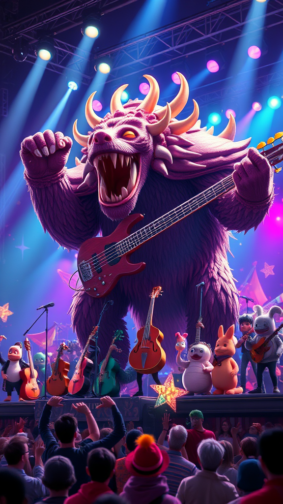 A vibrant and heartwarming animation key shot of a majestic band behemoth passionately performing on stage, capturing the essence of a Studio Ghibli, Pixar, and Disney collaboration. Rendered in stunning 3D with the sharp detail and rich textures achievable in Unreal Engine 5, the scene exudes a magical blend of anime key art illustration inspired by Greg Rutkowski. The composition features dramatic lighting and a soft bloom effect, highlighting the behemoth's expressive movements and majestic presence. Surrounding him, an array of diverse, whimsical musical instruments, each uniquely designed, adds to the enchanting atmosphere, as colorful stage lights dance across the scene, casting playful shadows. The crowd, a joyful mix of fantastical creatures and enthusiastic fans, can be seen in the background, their faces alight with wonder and delight.
