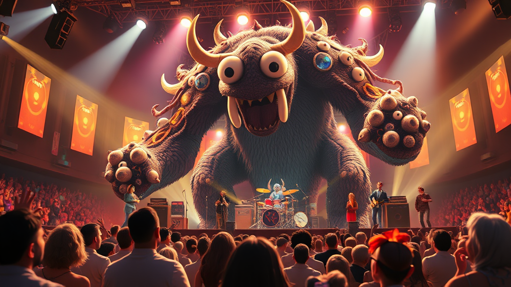 A vibrant and heartwarming medium shot of a colossal band behemoth energetically performing on stage, capturing the essence of a Pixar, Studio Ghibli, and Disney-style animation. The scene features 3D character models with sharp, intricate details, rendered beautifully in Unreal Engine 5. The atmosphere is enhanced by soft bloom effects and dramatic, yet inviting lighting, creating an enchanting ambience. The composition reflects artistic influences akin to anime key art by Greg Rutkowski, with a touch of whimsical creativity—perhaps the behemoth has playful features like oversized, expressive eyes and whimsical musical instruments. The audience is visible in the background, filled with diverse characters, each expressing joy and awe, highlighting the communal experience of music and celebration.