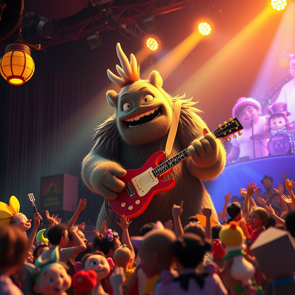 A vibrant and heartwarming scene capturing a colossal band behemoth joyfully performing on stage in a medium shot, blending the enchanting styles of Studio Ghibli, Pixar, and Disney animation. The 3D render is exquisitely sharp, crafted in Unreal Engine 5, with anime key art influences by Greg Rutkowski. The atmosphere is suffused with bloom effects and dramatic lighting, casting a magical glow over the scene. The behemoth, a gentle giant with a playful expression, skillfully plays an oversized guitar, surrounded by whimsical, colorful instruments. The audience, a mix of delighted creatures and enchanted beings, sways in rhythm, their faces illuminated by the warm stage lights, creating an aura of joy and harmony.