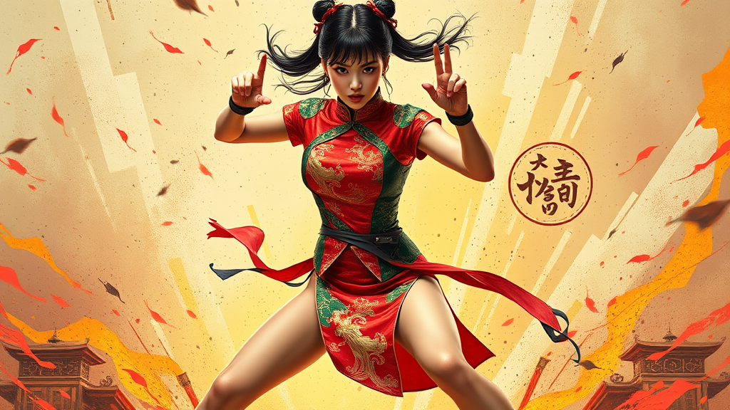 A vibrant and high-saturation depiction of a full-body domineering lady engaged in a dynamic fighting stance. She wears a striking Chinese cheongsam, accentuating her elegant, slender thighs. The scene captures energy and movement, with a focus on her fierce expression and poised demeanor. Despite the intensity of the moment, there are artistic imperfections; limbs appear slightly disconnected, hinting at motion blur, and the anatomy is stylized, adding a surreal quality to the artwork. Occasional watermarks and text elements subtly appear, blending into the chaotic energy of the piece. There's a sense of rawness and uniqueness, with wisps of detail suggesting intricate but abstract backgrounds, all wrapped in a creative and imaginative frame.