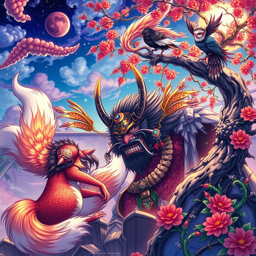 A vibrant and highly detailed anime-style illustration featuring a mythical kitsuné with shimmering, multi-tailed fox form beside a formidable Oni, its imposing figure adorned with intricate armor. A Nué perches nearby, its composite features blending seamlessly with the surreal landscape. High atop a tree, a majestic Tengu contemplates, its avian visage sharp and enigmatic. The scene is enriched with mesmerizing funji decor, flourishing in vibrant patterns and hues. The atmosphere is one of mystic allure, bathed in HD clarity and 2K resolution, capturing every nuance in exquisite detail.