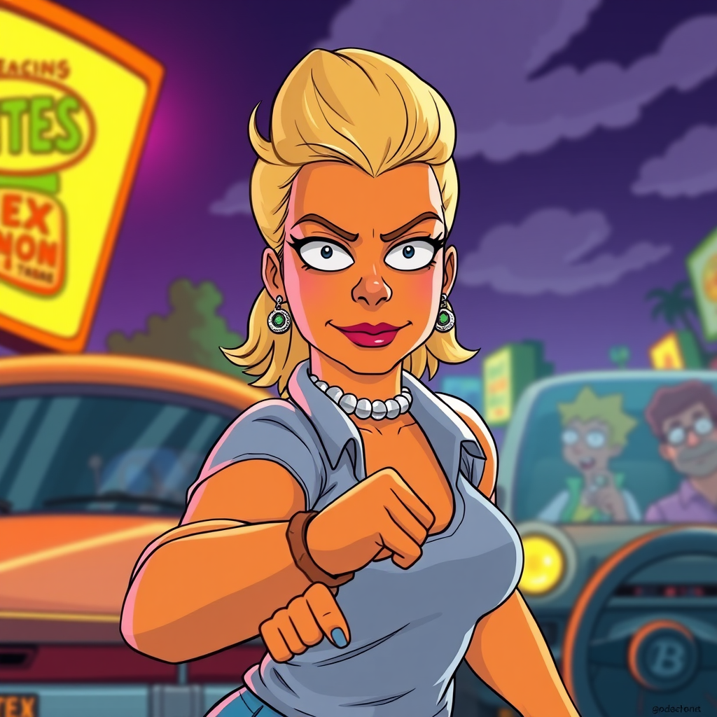 A vibrant and highly detailed illustration of Margot Robbie depicted in the style of The Simpsons, created by Matt Groening, featuring a full-body view in an action pose. The scene is cinematic and epic, with a background that complements her character's personality. The artwork is enhanced by dramatic rim lighting and light shading, showcasing a color-graded palette that brings out the scene's depth. Rendered in 4k resolution with an array of bright and colorful tones, capturing the essence of The Simpsons' whimsical yet dynamic world.