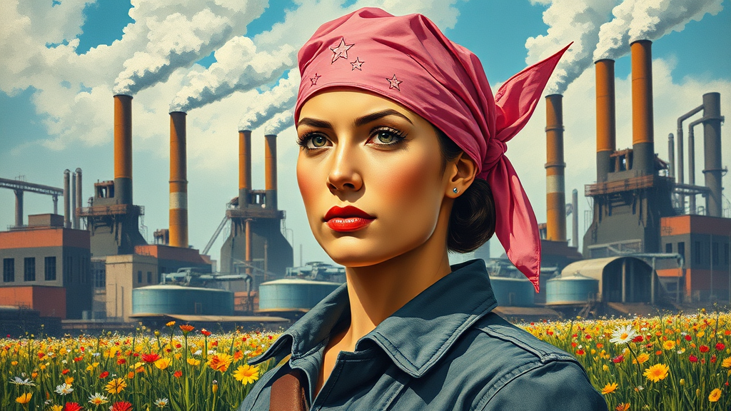 A vibrant and intricately detailed masterpiece of Socialist Realism, capturing a strong and determined woman wearing a pink bandana and hat. She stands resolute amidst an industrious landscape, reminiscent of bustling Soviet factories, with billowing smokestacks and machinery humming in the background. Her features are rendered with bold and confident brushstrokes, clearly inspired by Alexander Deyneka's iconic style. The dynamic angles of the composition draw the viewer’s eye across the scene, while the lighting casts dramatic shadows, highlighting the intensity and purpose in her expression. In a creative twist, the setting includes elements of both urban progress and serene nature, juxtaposing the woman's steadfast labor with fields of colorful wildflowers gently swaying in the breeze. The high resolution of the painting reveals intricate textures in her clothing and background details, creating an immersive and lifelike representation of strength and unity.