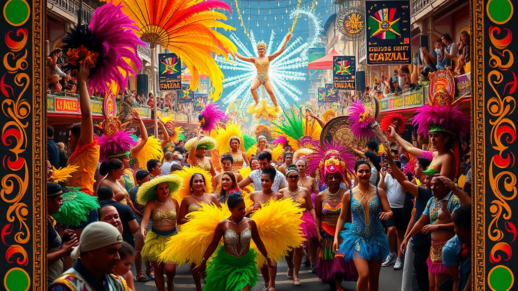 A vibrant and lavish Brazilian carnival celebration, set against an ornate, colorful background with intricate borders framing the scene. The atmosphere is filled with the energy and rhythm of samba dancers in flamboyant costumes, adorned with feathers and sequins glistening under sparkling lights. The narrow, vertical composition captures the essence of the festival, highlighting the parade of joyful performers and whimsical floats moving through the lively crowd. The air is alive with the sound of music and laughter, creating a sensory feast that immerses you in the heart of the celebration.