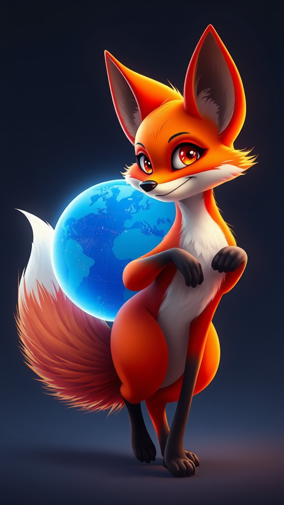 A vibrant and lifelike animated fox with sleek, fiery orange fur and wisps of deep red hues, its eyes gleaming with intelligence and curiosity. This majestic creature moves gracefully with sharp, fluid motions, capturing the essence of a digital guardian. Its bushy tail elegantly wraps around a glowing, blue sphere representing the globe, subtly humming with digital energy. The contrasting colors of the fox and the sphere create a harmonious balance, accentuating the fox's role as a protector of the digital world, its fur occasionally shimmering with a hint of golden highlights, adding a magical touch to its animated presence.