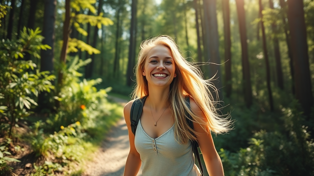 A vibrant and lifelike photo capturing a blonde influencer joyfully exploring a lush forest trail on a bright, sunny day. She exudes a relaxed and carefree vibe, perfectly blending with the natural surroundings. The sunlight creates a warm, golden glow around her, highlighting her cheerful expression and capturing the essence of a perfect outdoor adventure.