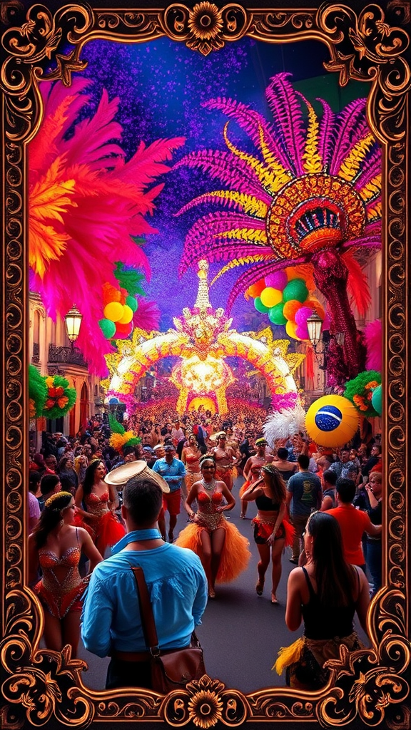 A vibrant and opulent scene of a Brazilian carnival celebration, featuring an explosion of vivid colors and rich textures in the background, with intricate and ornate borders framing the festivities. The atmosphere is electric with a kaleidoscope of feathers, sequins, and glittering costumes parading through the streets. Samba dancers sway rhythmically to the pulsating beats of lively music, embodying the spirit of joy and celebration. Giant, elaborately decorated floats glide by, each a masterpiece of creativity and craftsmanship. The lively crowd, adorned in festive attire, joins in the exuberant revelry, their infectious energy illuminating the night. The setting is a harmonious blend of tradition and modern extravagance, capturing the essence of one of the world’s most famous cultural celebrations.