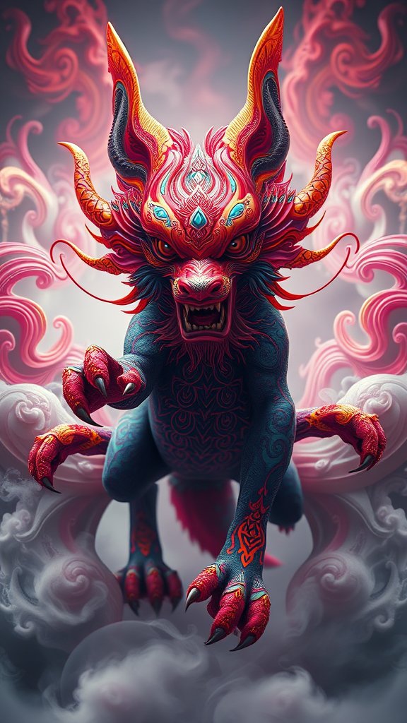 A vibrant and ornate mythical fox demon with intricate details emerges in a psychedelic scene, surrounded by turbulent fluid forms and fractal elements. The atmosphere is smokey with symmetrical patterns, rendered in sharp focus. Volumetric fog creates a sense of depth, enhanced by studio lighting that highlights the vivid colors. Utilizing Unreal Engine and Octane Render, the scene employs raytracing techniques. With an intentional emphasis on low resolution, elements like missing fingers, extra digits, and cropped perspectives add a surreal touch. The fox demon's form is both mesmerizing and unsettling, its anatomy purposefully disfigured with extra limbs, and its hands and feet drawn in a distorted manner. The image features jpeg artifacts, suggesting a digital signature, while the composition embraces out-of-frame elements and tiling for an abstract effect. Despite its beauty, there is a disquieting elegance to the deformed and mutated aspects, with blurry sections that convey a dreamlike quality. The piece could be interpreted as both fascinating and grotesque, with watermarks subtly hinting at an otherworldly origin.