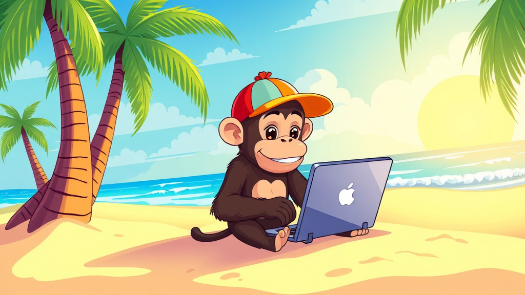 A vibrant and playful vector illustration featuring a monkey wearing a colorful cap and sitting on a sandy beach, intently focused on a laptop, surrounded by palm trees and ocean waves, as it codes creative AI applications in a world of bright, lively colors.