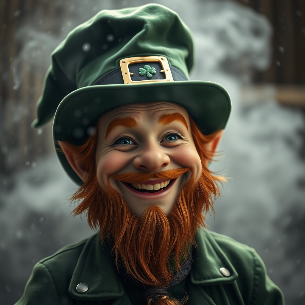 A vibrant and professional portrait captures a cheerful leprechaun donning a stylish cap, set against a backdrop of misty, wet, and stormy weather. The scene is shot with a 70mm lens, emphasizing a cinematic and intricate composition, with the detailed grains of wood in the background beautifully highlighted. The lighting is dramatic, casting striking contrasts and bringing the leprechaun's joyful expression into sharp focus. This medium shot is enveloped in volumetric fog, adding depth and mystique, while the high-dynamic range delivers stunning clarity. The image is rendered in ultra-realistic 4k and 8k resolution, offering an immersive visual experience.