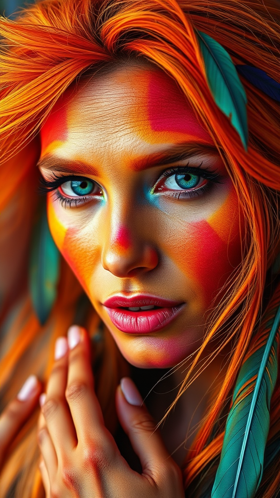 A vibrant and psychedelic portrait of a North American Indian woman with feathers elegantly woven into her flowing orange hair. Her skin radiates a myriad of colors reminiscent of stained glass, capturing the essence of psychedelia. Her face is highly detailed with a focus on clarity and beauty, rendered in UHD, 8K resolution with HDR richness. The image showcases an artistic depth and sharpness, emphasizing her striking features and bold expression, framed in a way that offers symmetry and balance without distortion or disfiguration. The composition avoids low resolution elements, ensuring a crisp and seamless visual experience, free from extraneous artifacts or alterations. Her eyes are piercing and lively, set with a natural grace, complementing her regal bearing, while her hands are elegant, reflecting an authenticity free from mutations or abnormal features.
