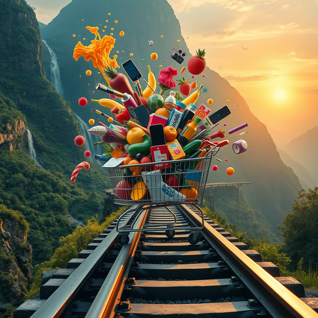 A vibrant and surreal image unfolds on a dramatic railway track that slices through a picturesque mountainous landscape, adorned with lush greenery and cascading waterfalls. At the heart of this scene is a shopping cart, precariously poised on the rails. It's teeming with an explosion of colorful items that symbolize the bountiful excesses of e-commerce. The cart overflows with a kaleidoscope of fresh fruits, vegetables, electronic gadgets, and household items, all intertwined with whimsical splashes of bright, paint-like textures. These textures spill out, creating a soaring trail that reaches into the sky. The scene melds the dynamic, upward trajectory of objects with a dense, gravity-defying arrangement that adds depth, showcasing a dizzying array of floating products. As the sun sets in the backdrop, its warm, golden light envelops the scene, casting elongated shadows and amplifying the visual drama. The image boasts a hyper-realistic quality, with meticulous attention to the textures and materials. The light and shadows are rendered convincingly, infusing the scene with overwhelming vibrancy and kinetic energy. This captivating artwork falls within the realm of Surrealism or Modern Fantasies, emphasizing dynamic and colorful aspects while excluding any static or dull elements. Enriched with high saturation and dynamic composition, it captures the intended essence in a surrealistic style.