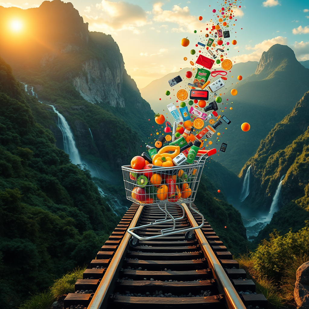 A vibrant and surreal scene unfolds on a dramatic railway track cutting through a picturesque mountainous landscape. The lush greenery and cascading waterfalls surround a dynamic focal point: a shopping cart perched on the rails. This cart overflows with an explosion of colorful objects representing the excesses of e-commerce, including fresh fruits, vegetables, electronic gadgets, and household items, all amidst whimsical splashes of bright, paint-like textures. These vivid elements create a trail that extends into the sky, accentuating an upward trajectory alongside a dense arrangement of floating products that defy gravity. The setting sun bathes the scene in warm, golden light, casting elongated shadows and enhancing its visual drama. Hyper-realistic textures and meticulous attention to light and shadows create an overwhelming atmosphere of vibrancy and kinetic energy. The surreal artwork evokes modern fantasies, with high saturation and dynamic composition, capturing the imagination with fantastical commercial opulence.