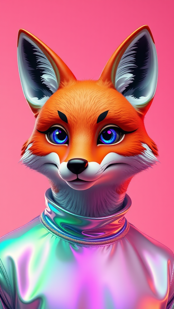 A vibrant and ultra-detailed 3D render of a cartoon fox head on a human body, exuding a bossy demeanor, the fox is adorned in an iridescent holographic liquid-textured, translucent sun-protective shirt. The shirt is inspired by high-fashion sports brands like Nike or Adidas, with a touch of WitchPunk and Y2K style. The color palette is rich in greens and blues with a strong metallic feel and high reflection. The background is a pure, single-color, adding to the surreal futuristic vibe. This artwork's digital fashion and surreal futurism aesthetics draw inspiration from high-resolution Supreme Kong NFT, Bored Ape Yacht Club NFT, and Disney styles, resulting in a headshot that embodies the essence of a fashion editorial. The image is rendered in 8K resolution, showcasing high detail, fine luster, and a captivating face shot with bright front lighting, capturing the essence of NFT 3D IP while introducing subtle creative twists.
