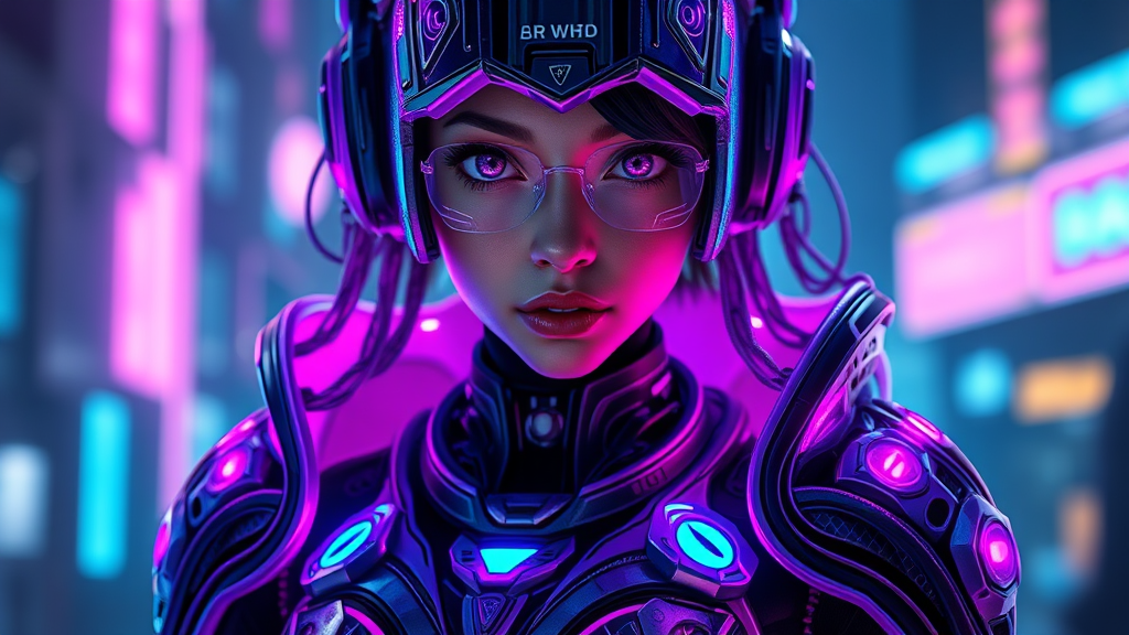 A vibrant and ultra-realistic cyberpunk girl stands confidently, her full body adorned in intricate, luminous purple and azure neon armor that glows with electric energy. Ornate and meticulously detailed, her attire showcases swirling patterns and cutting-edge technology, highlighted by dramatic cinematic lighting. Her eyes sparkle with intensity, capturing the hyperrealistic essence of a futuristic world. The scene is crafted with the precision of Unreal Engine 5, presenting a cinematic experience that's trending on ArtStation. This 4k, sharply focused image immerses the viewer in its high-definition, detailed glory, capturing the essence of a cybernetic future, all set against a stylized 9:16 aspect ratio backdrop.