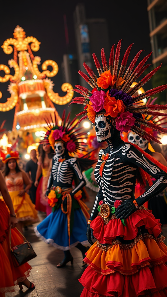 A vibrant and ultra-realistic depiction of the Dia de los Muertos Parade in Mexico City, showcasing intricate costumes and face paint, lively dancers, and ornate floats under the city lights, captured in high-resolution photography with an aspect ratio of 1:2 and enhanced with a stylized flair, creating a dynamic and immersive atmosphere.