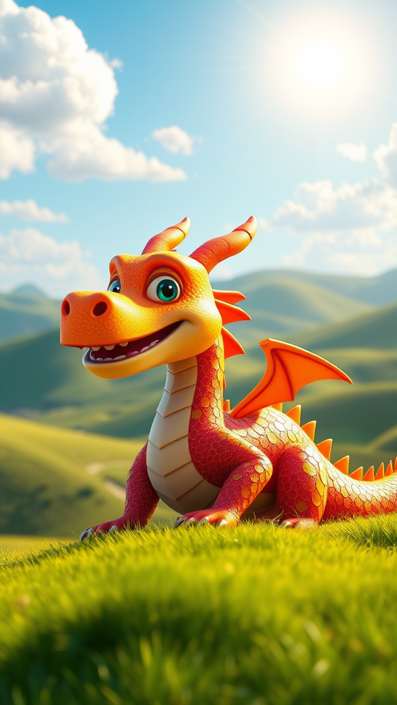 A vibrant and whimsical 3D animation scene depicting a cheerful dragon basking in the sun's rays, rendered in a style reminiscent of Pixar's distinct animation. The dragon displays shimmering scales of various bright colors, casting playful reflections around it. The backdrop is a cinematic landscape with rolling green hills and a crystal-clear sky, where puffy white clouds float lazily. The scene is infused with stylized, imaginative elements, enhancing its magical and uplifting atmosphere.