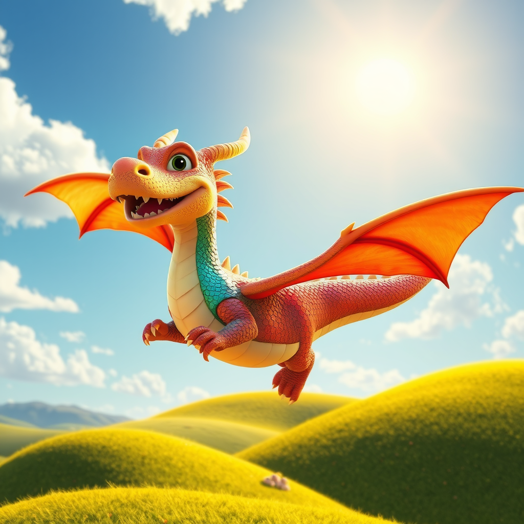 A vibrant and whimsical 3D Pixar-style scene featuring a friendly dragon soaring through a sunny sky, bathed in cinematic lighting. The dragon's scales shimmer in a multitude of bright colors as it playfully swoops down over a lush, rolling landscape. Puffy white clouds float lazily in the background, and the sun casts warm, golden rays that illuminate the entire scene, creating a joyful and enchanting atmosphere.