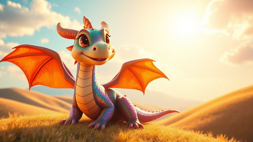 A vibrant and whimsical 3D scene featuring a cheerful Pixar-style dragon basking in warm sunlight amidst rolling hills. The dragon's scales glisten with a rainbow sheen, casting playful reflections around the bright, lush landscape. Large, expressive eyes and a gentle smile give the creature a friendly demeanor, while its wings spread wide, catching the light in a mesmerizing display. The background is a cinematic, wide aspect ratio view of a tranquil morning, with soft, stylized clouds drifting across a clear blue sky and distant mountains adding depth to the scene.